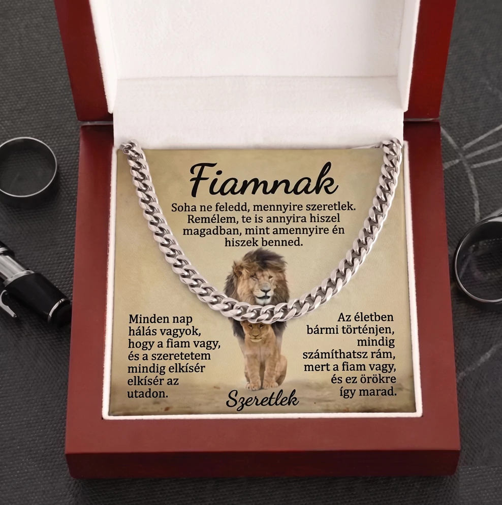 Ez a különleges nyaklánc az oroszlán erejét és méltóságát idézi, emlékeztetve őt arra, hogy mindig legyen bátor, higgyen önmagában, és kövesse az útját. A hozzá tartozó megható üzenet minden nap erőt ad neki, és biztosítja arról, hogy bármi történjen is, mindig számíthat rád.